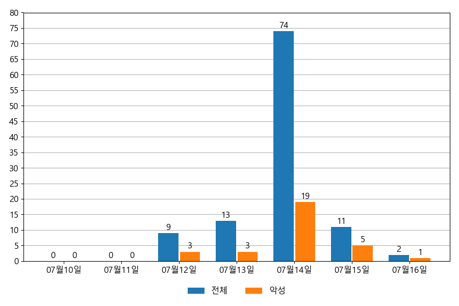 일일 유입량은 하루 최저 2건(악성 1건)에서 최대 74건(악성 19건)으로 일별 편차를 확인할 수 있습니다.
