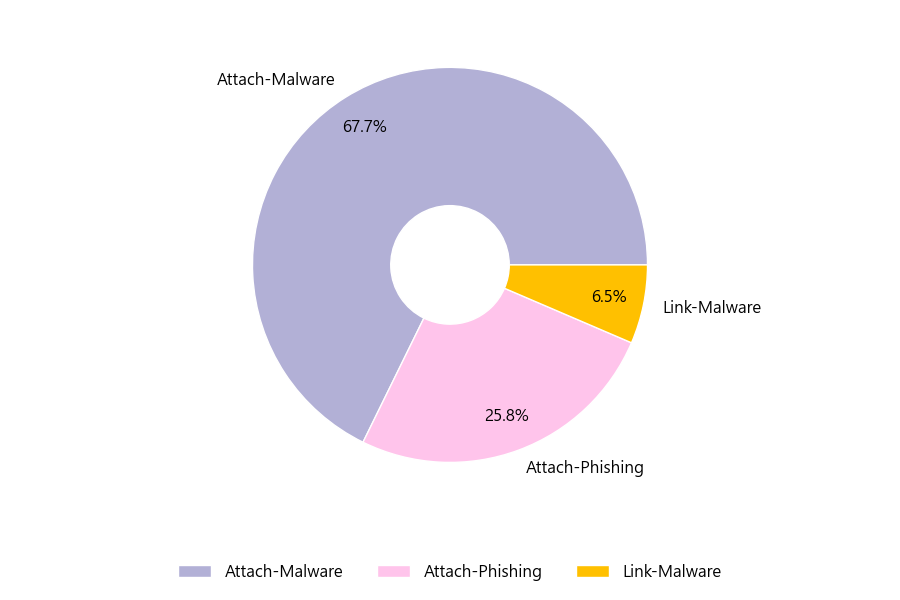 악성 이메일을 유형별로 살펴보면 31건 중 Attach-Malware형이 67.7%로 가장 많았고 뒤이어 Attach-Phishing형이 25.8%를 나타냈습니다.
