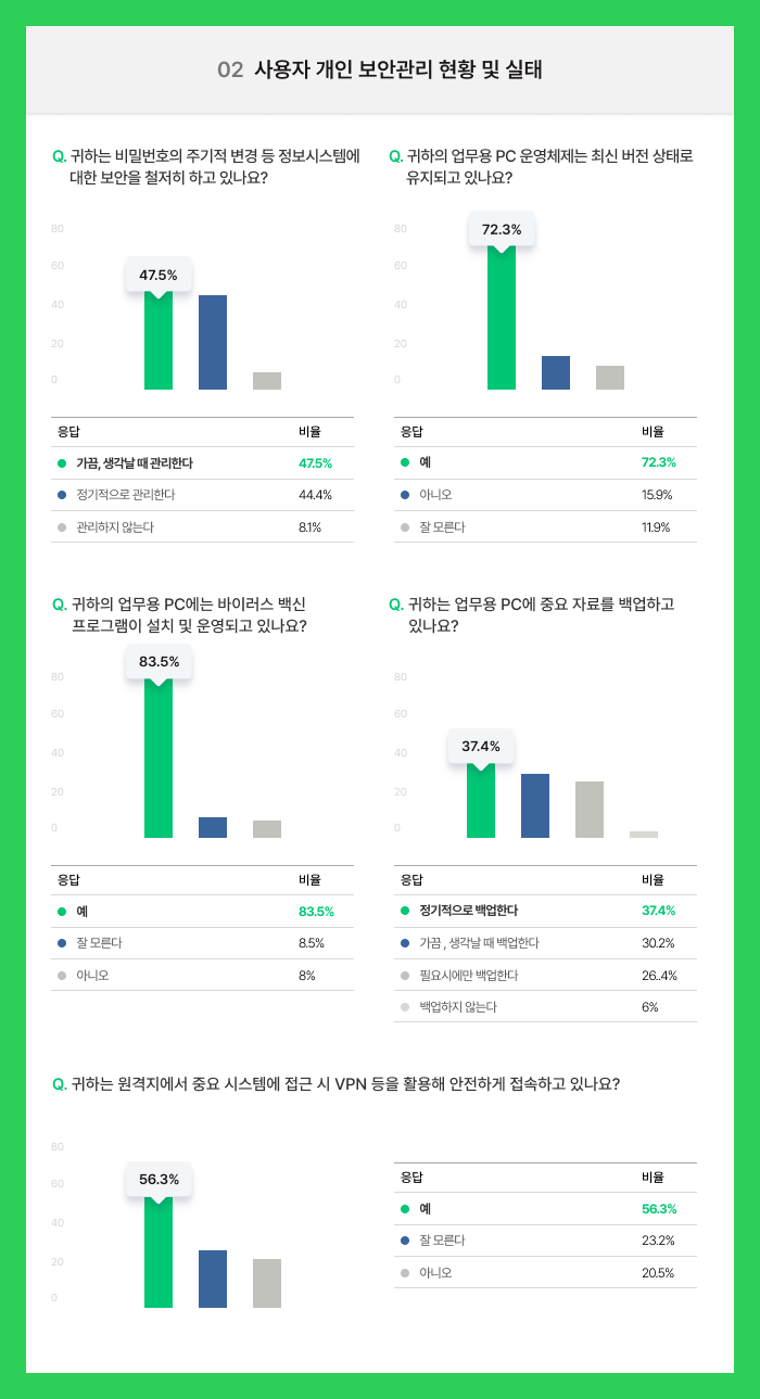지금 바로 설문조사 결과를 통해 우리의 보안 인식은 어디까지 와 있는지, 또 잘 대응하고 있는지 확인해보도록 하겠습니다.