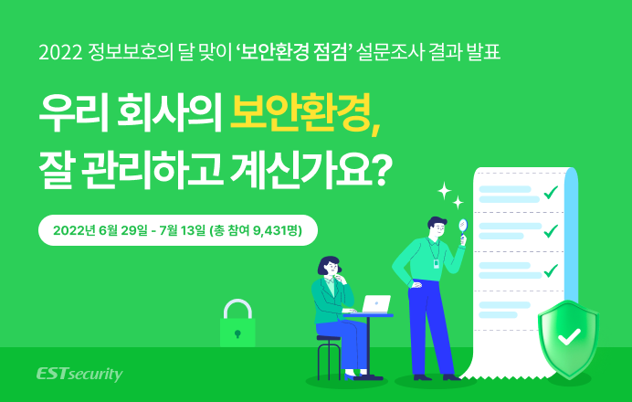 7월 정보보호의 달을 맞이하여 이스트시큐리티에서는 ‘보안환경 점검’ 설문조사를 실시했습니다. 이번 설문조사는 6월 29일부터 7월 13일까지 15일간 진행되었으며, 총 9천 명이 넘는 많은 분께서 설문에 응답해주셨습니다.