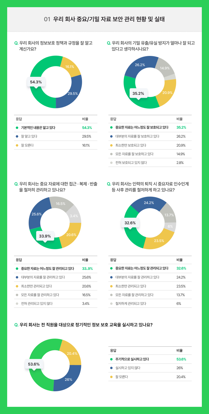 실제, 이번 설문 조사에 참여한 응답자 중 불과 29.5%만이 회사의 정보보호 정책과 규정에 잘 알고 있다고 응답했고, '기본적인 내용만 알고 있다'는 54.3%, '잘 모른다'는 16.1%로 조사됐습니다.