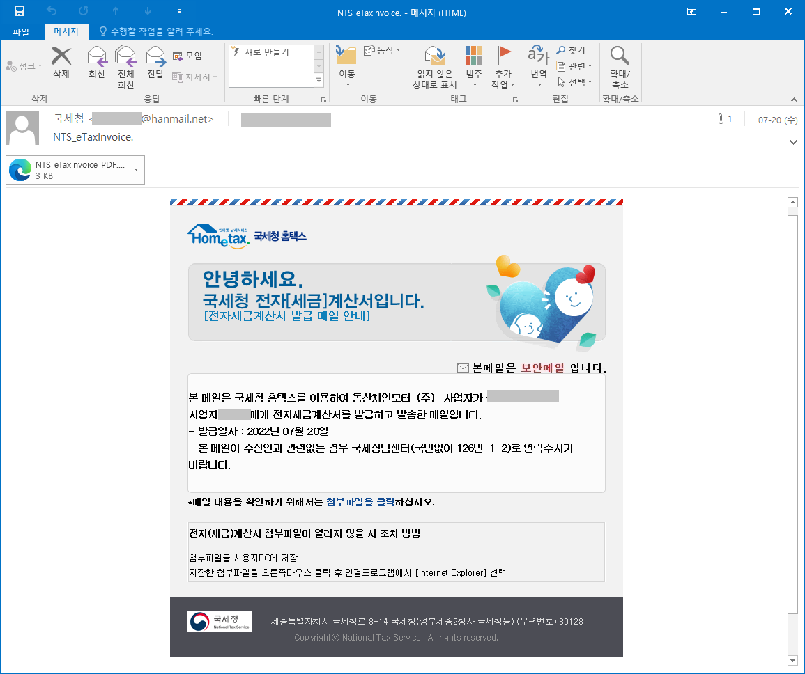 국세청을 사칭한 전자세금계산서 피싱 메일이 유포중에 있어 사용자들의 주의가 필요합니다.