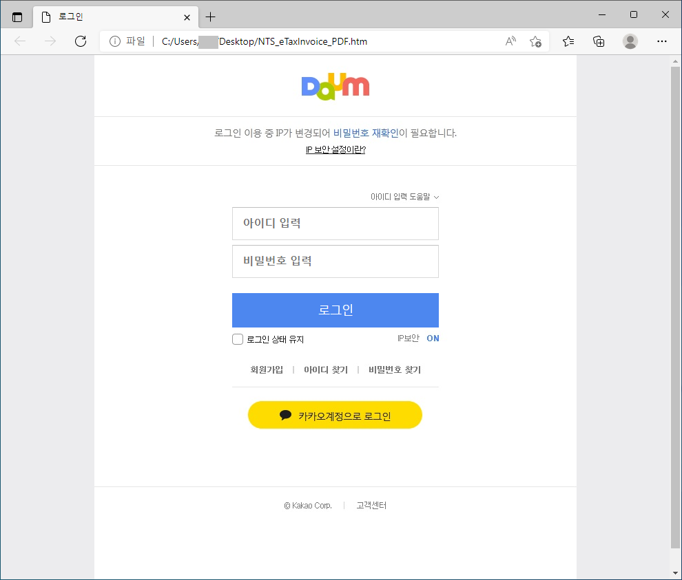 해당 이메일에는 NTS_eTaxInvoice_PDF.html 파일이 첨부되어 있어 사용자들의 클릭을 유도하며, 사용자가 해당 파일을 실행하면 계정정보 입력을 유도하는 피싱 페이지로 연결됩니다.