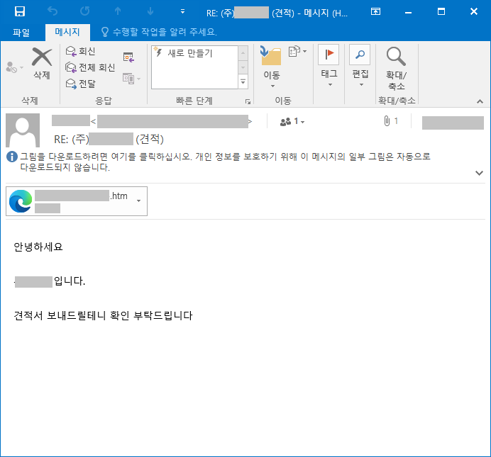 이번에 발견된 공격은 피싱메일을 통해 진행되며, 일반적인 견적서 메일을 위장하고 있으며, 견적서 확인요청 내용과 함께 html 파일이 첨부되어 있습니다.