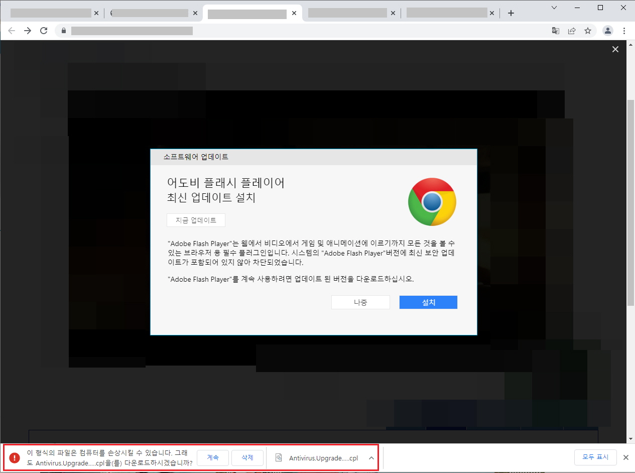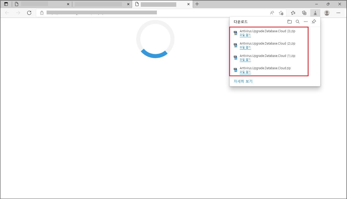 사용자가 이러한 홈페이지들에서 서비스를 이용하는 과정에서 의도적으로 혹은 실수로 광고를 클릭하여 광고 서버에 접속되게 되는 경우가 있습니다. 사용자가 광고를 클릭할 때마다 랜덤으로 광고 페이지에 접속되는데, 이때 해킹당한 광고서버에 접속하였을 경우 사용자 브라우저에 Antivirus.Upgrade.Database.Cloud 이름의 파일이 자동으로 내려옵니다.
