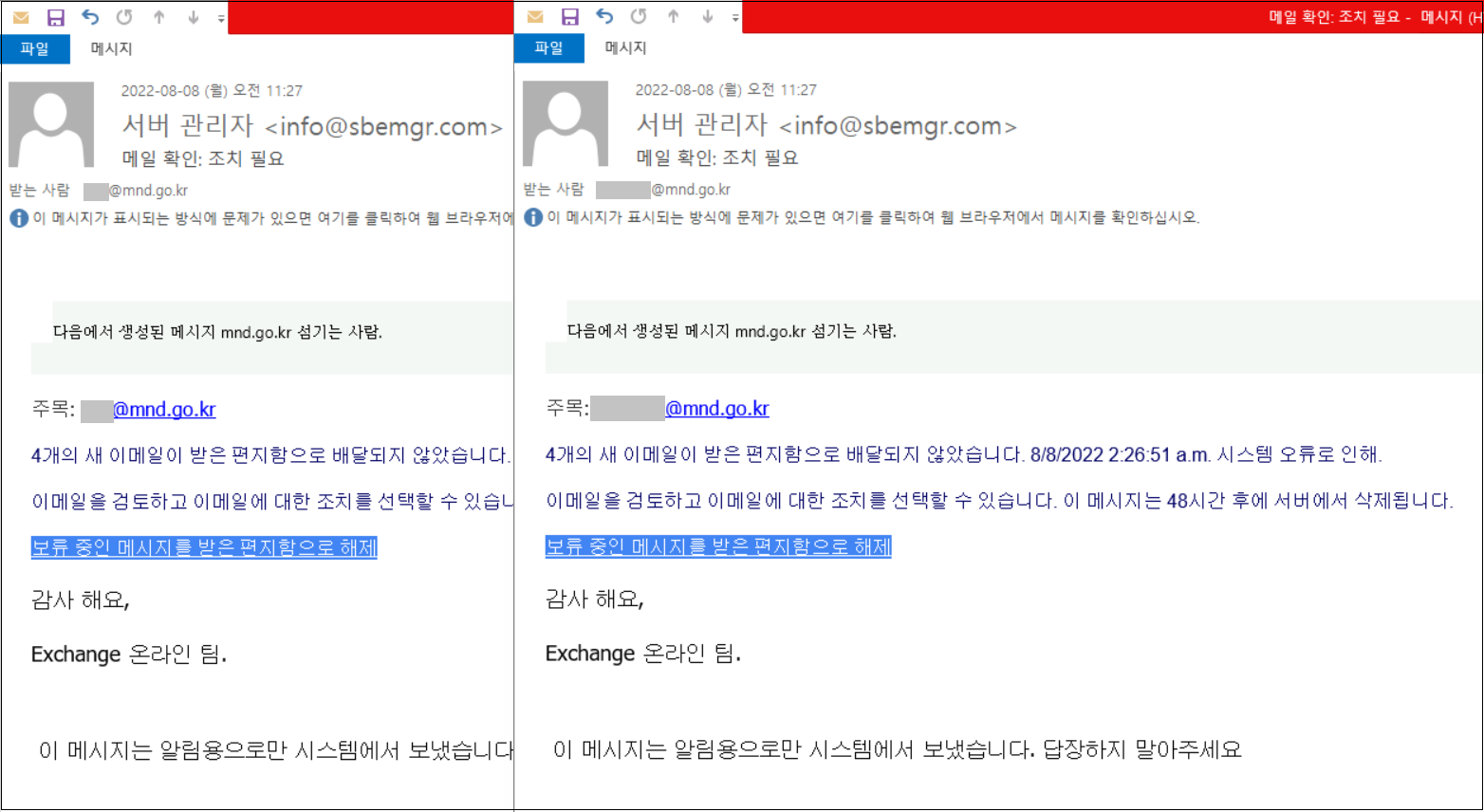 해당 메일은 국방 관련 부처 직원들을 대상으로 발송되었으며, [보류 중인 메세지를 받은 편지함으로 해제] 링크를 클릭하면 계정정보를 입력하는 피싱 페이지로 이동합니다.