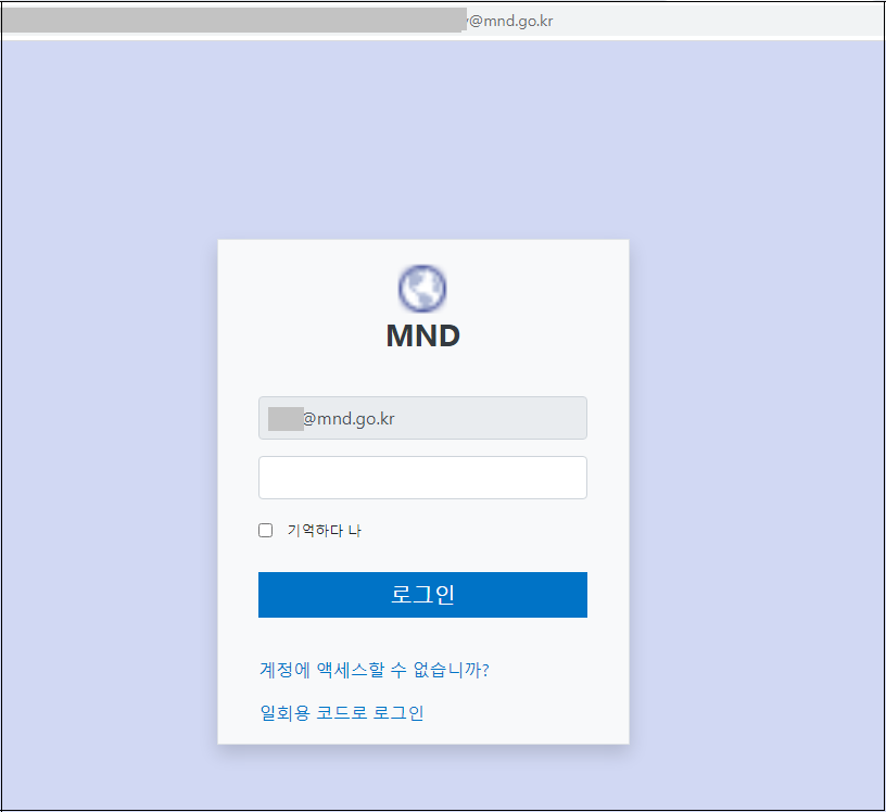 해당 메일은 국방 관련 부처 직원들을 대상으로 발송되었으며, [보류 중인 메세지를 받은 편지함으로 해제] 링크를 클릭하면 계정정보를 입력하는 피싱 페이지로 이동합니다.