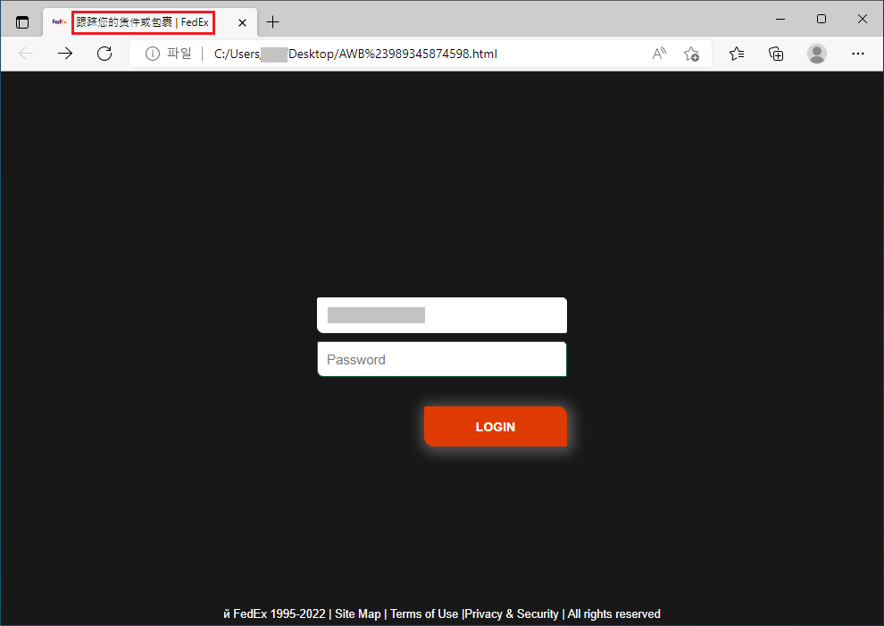 페이지 제목에 보면 중국어로 '跟踪您的货件或包裹(당신의 소포를 추적하세요)'라고 적혀있어 자세히 보면 피싱 페이지인 것을 인지할 수 있습니다.