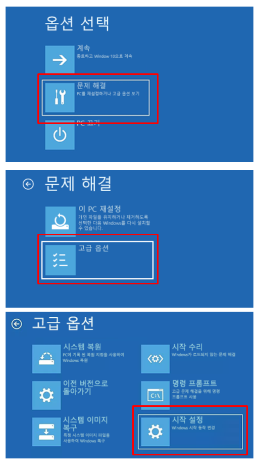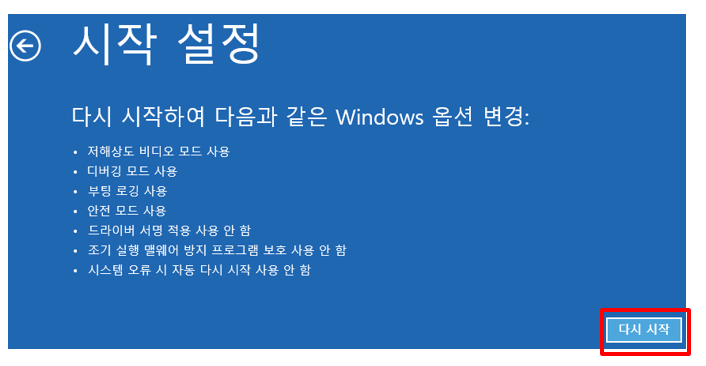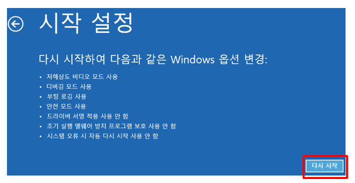 ⑤ 시작 설정 - 다시 시작에서 Enter를 누르면 검은 화면으로 다시 암전되었다가 아래 오른쪽 시작 설정 화면이 표시됩니다.
