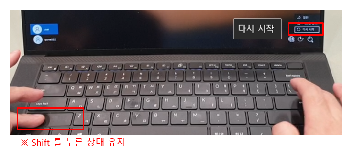 ② SHIFT 를 누른 상태를 유지하며, 키보드의 화살표 키로 [다시 시작] 을 선택한 후 Enter 를 누릅니다.