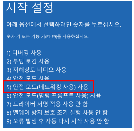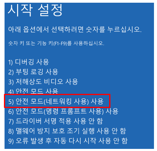 ⑥ 키보드 숫자키 5번을 눌러 안전 모드(네트워킹 사용) 사용을 선택합니다.