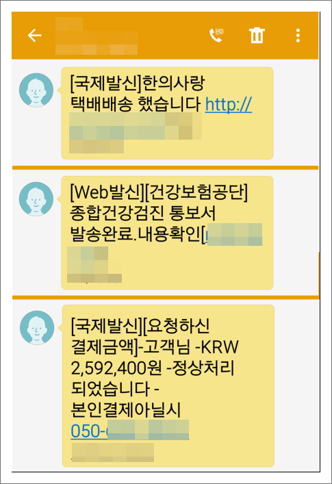 다음 그림은 발견된 스미싱 문자들의 화면입니다.