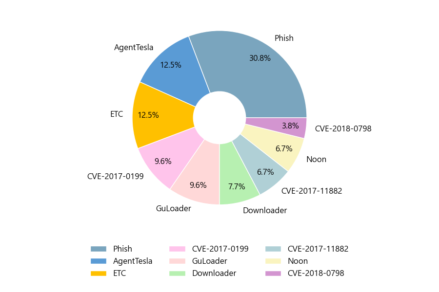 첨부파일은 ‘Phish’형태가 30.8%로 제일 큰 비중을 차지했고 뒤이어 ‘AgentTesla’, ‘ETC’가 각각 12.5%, 12.5%의 비중을 차지했습니다.
