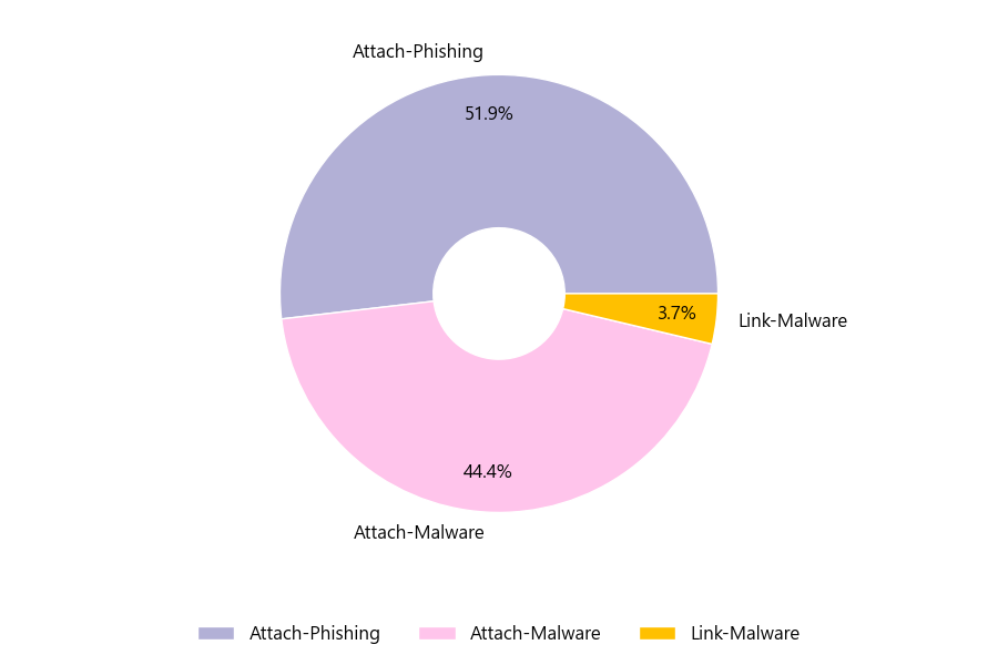 악성 이메일을 유형별로 살펴보면 27건 중 Attach-Phishing형이 51.9%로 가장 많았고 뒤이어 Attach-Malware형이 44.4%를 나타냈습니다.