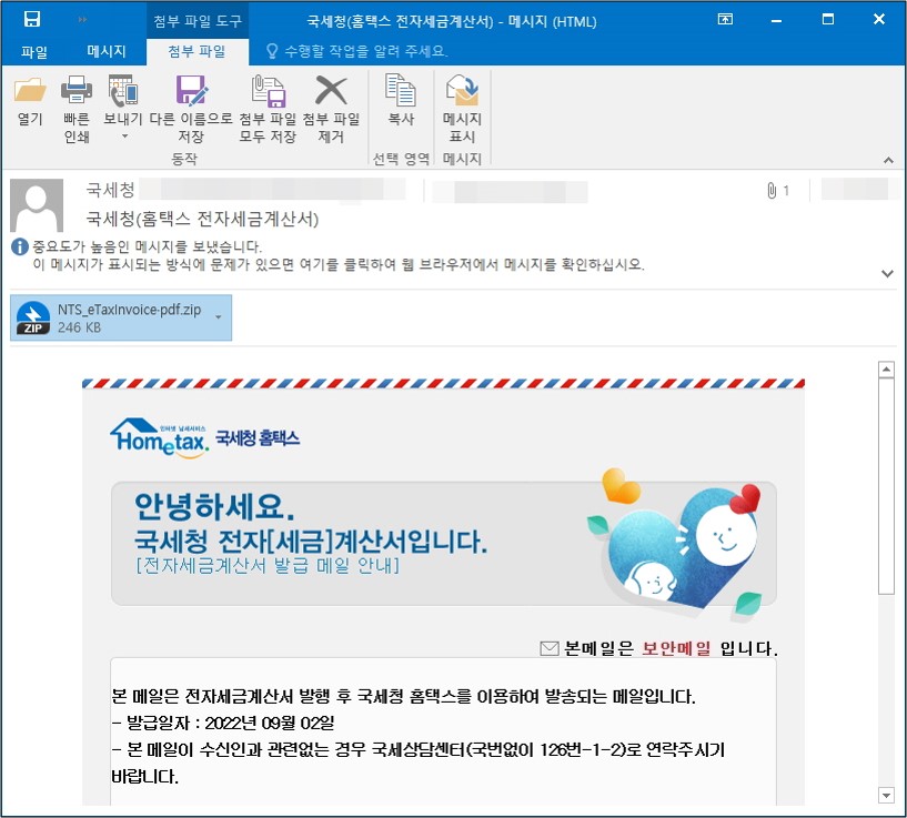 이번주 Pick으로는 세금계산서로 위장하여 유포 중인 Phishing 이메일을 선정했습니다. 특히 국세청 홈택스 양식을 그대로 모방하였기 때문에 사용자의 각별한 주의가 필요합니다.