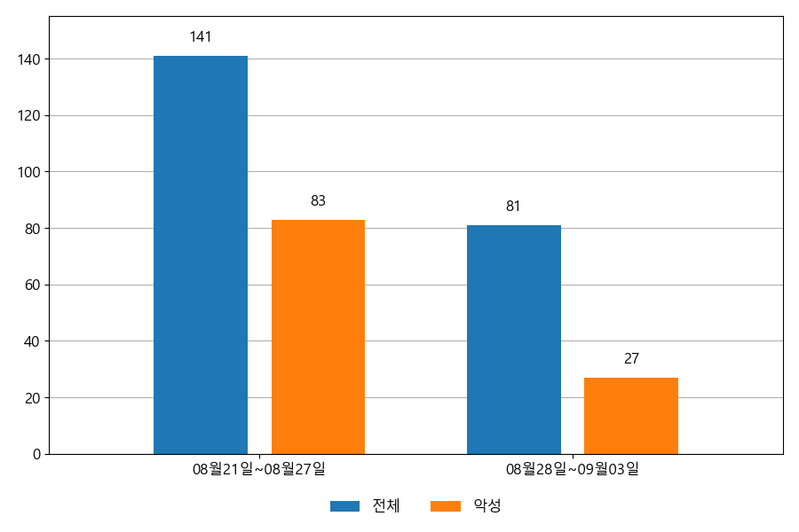 지난주 이메일 유입량은 총 81건이고 그중 악성은 27건으로 33.33%의 비율을 보였습니다. 악성 이메일의 경우 그 전주 83건 대비 27건으로 56건이 감소했습니다.