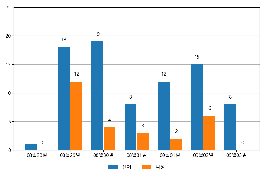 일일 유입량은 하루 최저 1건(악성 2건)에서 최대 19건(악성 12건)으로 일별 편차를 확인할 수 있습니다.