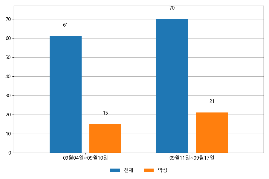 지난주 이메일 유입량은 총 70건이고 그중 악성은 21건으로 30.0%의 비율을 보였습니다. 악성 이메일의 경우 그 전주 15건 대비 21건으로 6건이 증가했습니다.