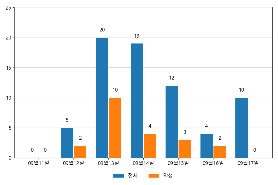 일일 유입량은 하루 최저 4건(악성 2건)에서 최대 20건(악성 10건)으로 일별 편차를 확인할 수 있습니다.