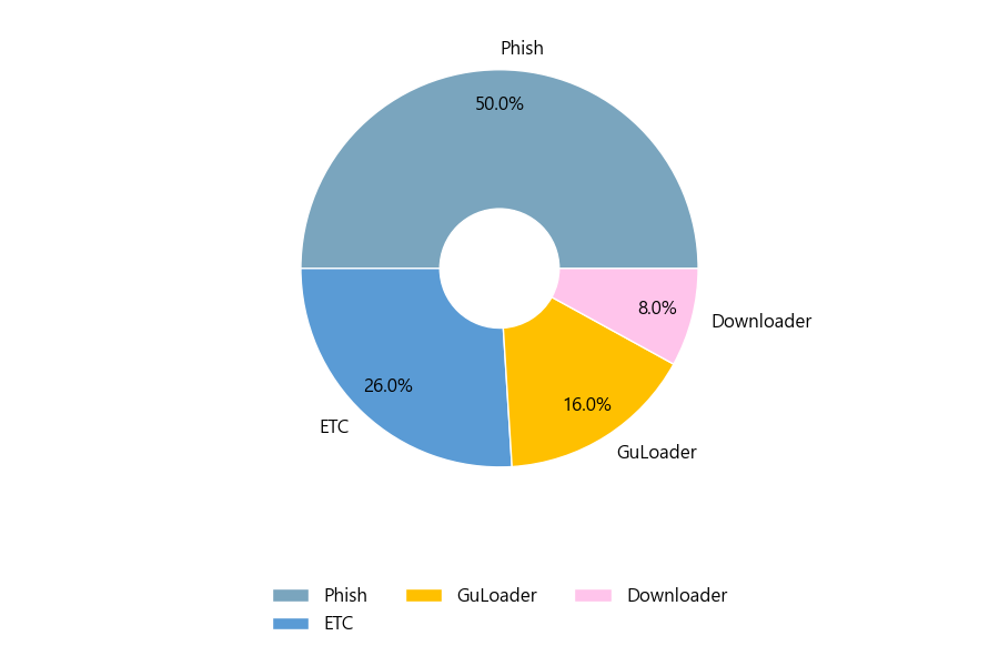 첨부파일은 ‘Phish’형태가 50.0%로 제일 큰 비중을 차지했고 뒤이어 ‘ETC’, ‘GuLoader’가 각각 26.0%, 16.0%의 비중을 차지했습니다.