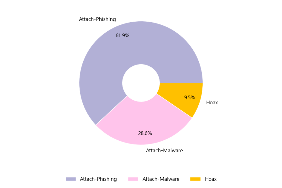 악성 이메일을 유형별로 살펴보면 21건 중 Attach-Phishing형이 61.9%로 가장 많았고 뒤이어 Attach-Malware형이 28.6%를 나타냈습니다.