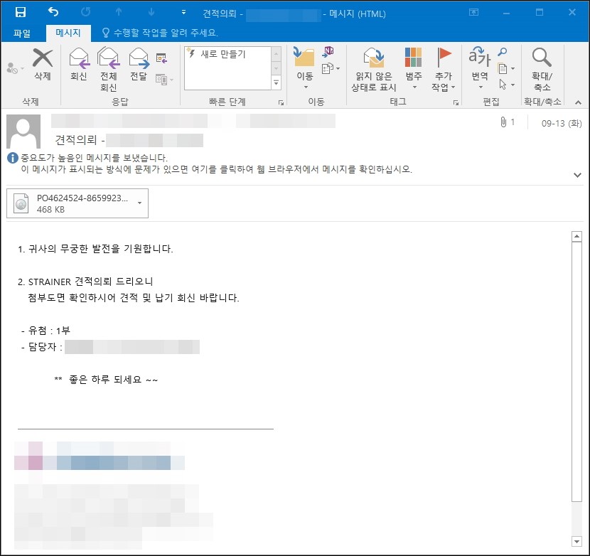 이번주 Pick으로는 특정 회사로 위장하여 유포 중인 Phishing 이메일을 선정했습니다. 회사 명함과 담당자 이름, 연락처를 기재하여 견적 의뢰를 요청함으로 사용자는 첨부파일을 실행하지 않도록 주의해야 합니다.
