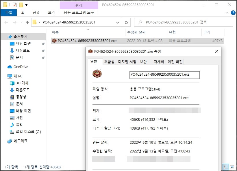 첨부파일은 .ISO로 되어 있으며 압축 해제 시 실행파일이 하나 나타납니다. 해당 파일은 악성코드로써 여러 파일을 추가로 드롭하고 악성 행위를 수행합니다.