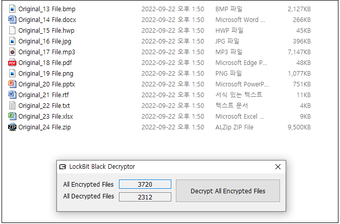 이후 빌드된 파일에 포함되어 있는 LB3Decryptor.exe 파일을 실행하면 암호화 된 파일들이 성공적으로 복호화 됩니다.