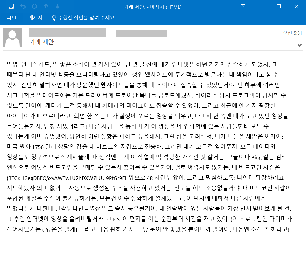 '거래 제안'이라는 제목으로 사용자들의 호기심을 유발하여 열람을 유도합니다. 본문에는 공격자가 해킹을 통하여 수신자의 은밀한 동영상을 수집하였으며, 해당 동영상의 유포를 원치 않으면 비트코인을 송금하라는 내용과 함께 '48시간 이내'라는 시간 제한 언급을 통하여 수신자들의 빠른 송금을 유도합니다.