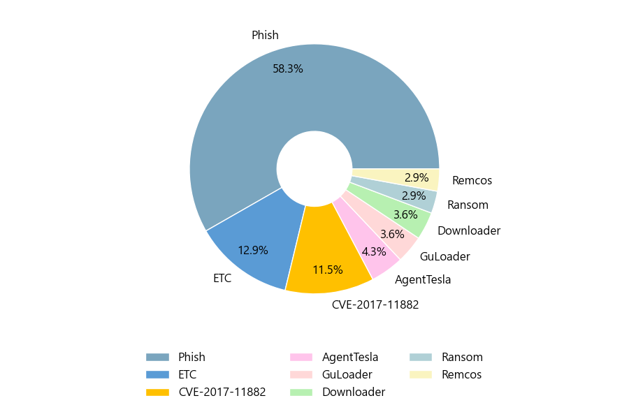 첨부파일은 ‘Phish’형태가 58.3%로 제일 큰 비중을 차지했고 뒤이어 ‘ETC’, ‘CVE-2017-11882’가 각각 12.9%, 11.5%의 비중을 차지했습니다.
