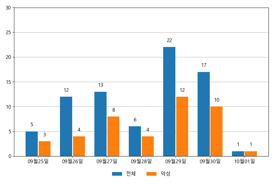 일일 유입량은 하루 최저 1건(악성 1건)에서 최대 22건(악성 12건)으로 일별 편차를 확인할 수 있습니다.