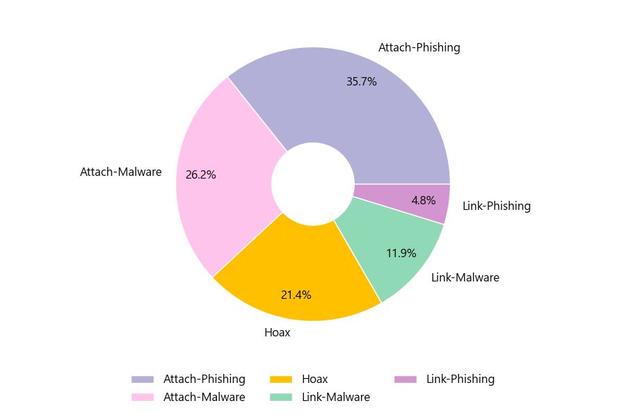 악성 이메일을 유형별로 살펴보면 42건 중 Attach-Phishing형이 35.7%로 가장 많았고 뒤이어 Attach-Malware형이 26.2%를 나타냈습니다.