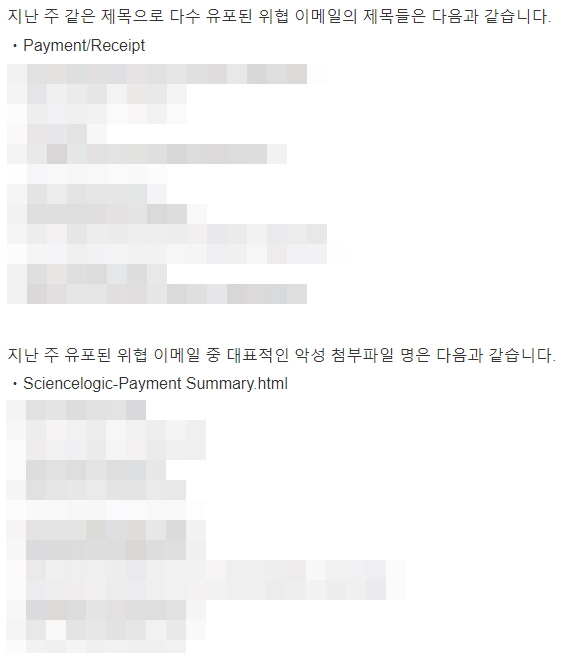 이번주 Pick으로는 사용자의 불안감을 활용하는 혹스 Phishing 이메일을 선정했습니다. 특히 대량으로 유포하고 있어, 주의가 요구되며 자세한 내용은 다음 글을 확인하시기 바랍니다.