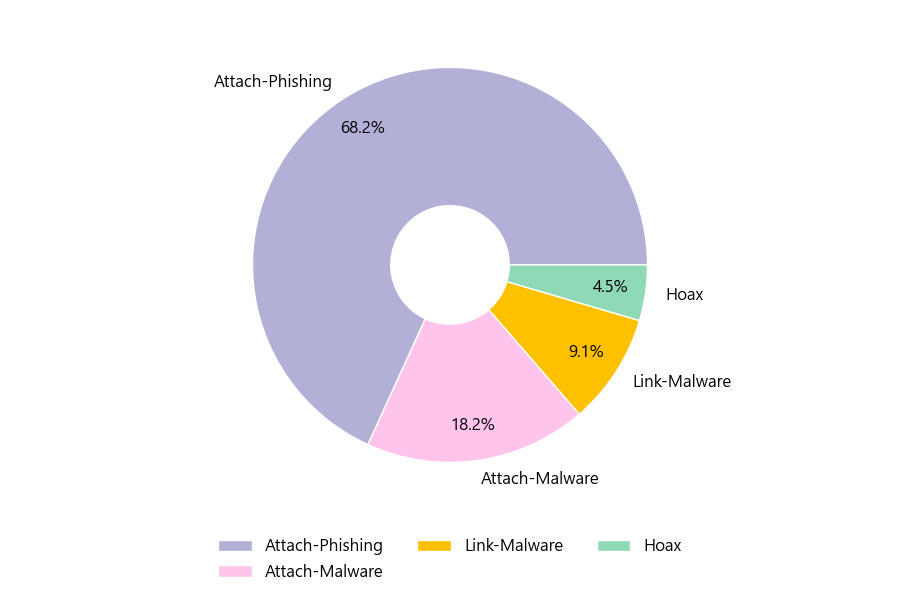 악성 이메일을 유형별로 살펴보면 44건 중 Attach-Phishing형이 68.2%로 가장 많았고 뒤이어 Attach-Malware형이 18.2%를 나타냈습니다.