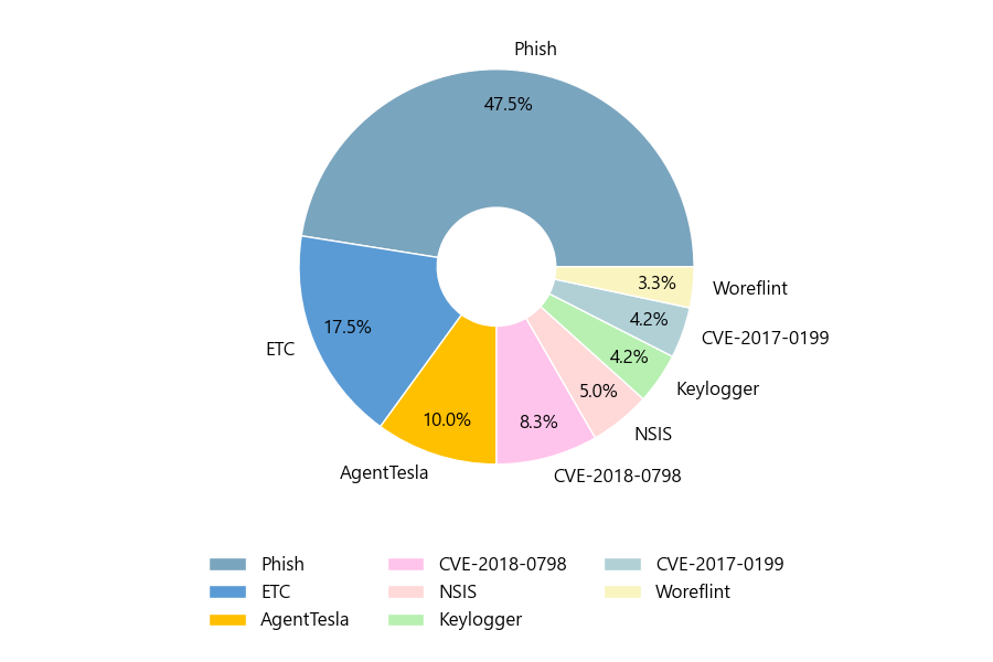 첨부파일은 ‘Phish’형태가 47.5%로 제일 큰 비중을 차지했고 뒤이어 ‘ETC’, ‘AgentTesla’가 각각 17.5%, 10.0%의 비중을 차지했습니다.
