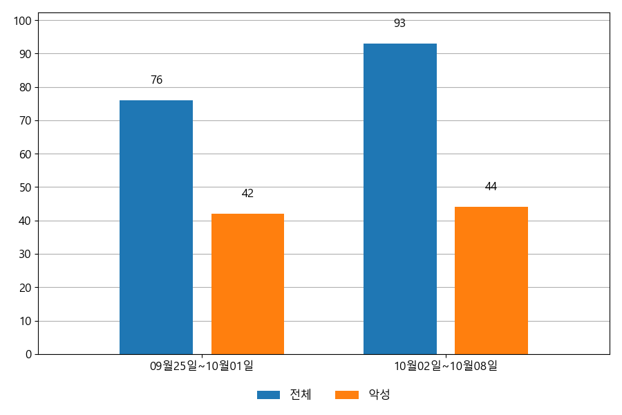 지난주 이메일 유입량은 총 93건이고 그중 악성은 44건으로 47.31%의 비율을 보였습니다. 악성 이메일의 경우 그 전주 42건 대비 44건으로 2건이 증가했습니다.
