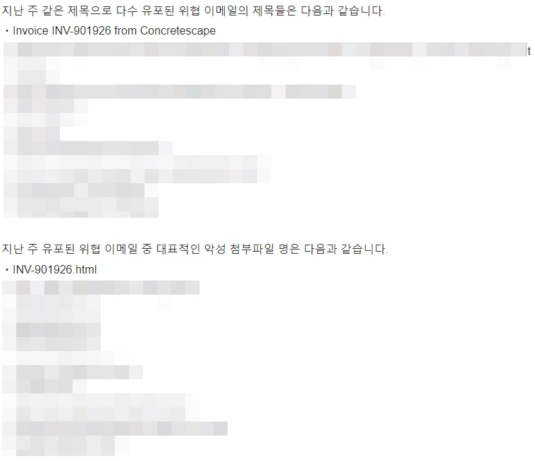 지난주 이메일 유입량은 총 93건이고 그중 악성은 44건으로 47.31%의 비율을 보였습니다. 악성 이메일의 경우 그 전주 42건 대비 44건으로 2건이 증가했습니다.