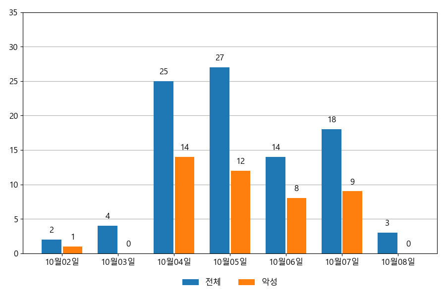일일 유입량은 하루 최저 2건(악성 1건)에서 최대 27건(악성 14건)으로 일별 편차를 확인할 수 있습니다.