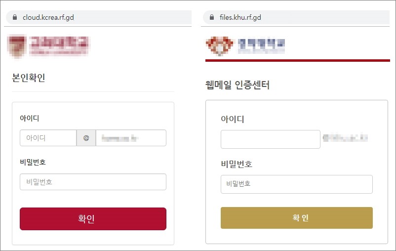 현재까지 고려대(cloud.kcrea.rf[.]gd), 경희대(files.khu.rf[.]gd), 경남대(clouds.kvongnum.rf[.]gd), 이화여대(ewha-cloud.epizy[.]com), 서강대(clouds.sogang.rf[.]gd) 등을 위장한 피싱 사이트가 발견되었습니다.