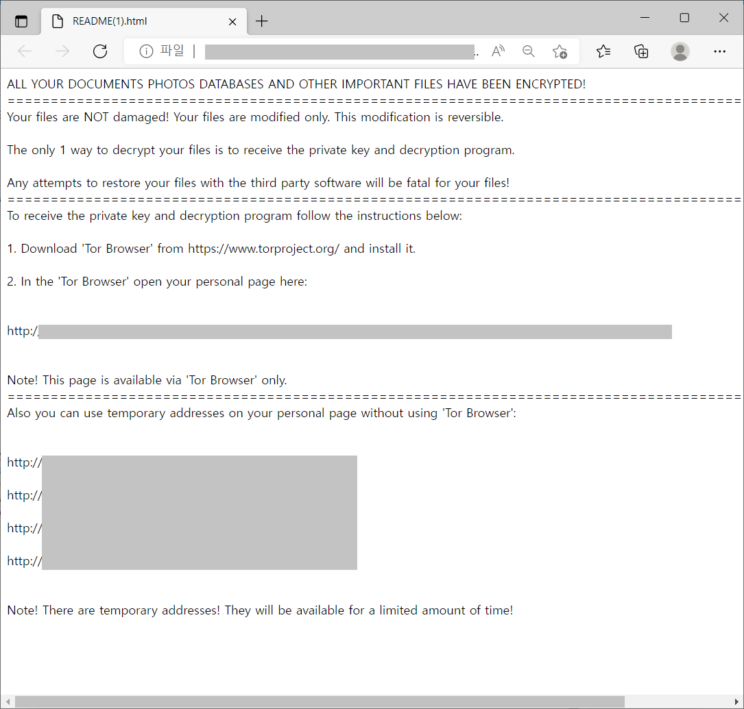 또한 타이포스쿼팅 방식을 통해 랜섬웨어가 유포되기도 하는 만큼 사용자 여러분들께서는 주소창에 주소 입력 시 입력한 철자가 맞는지 다시 한번 확인하시기 바라며, 직접 주소 입력보다는 포털 사이트 검색을 통해 접속하시는 것을 권고 드립니다.
