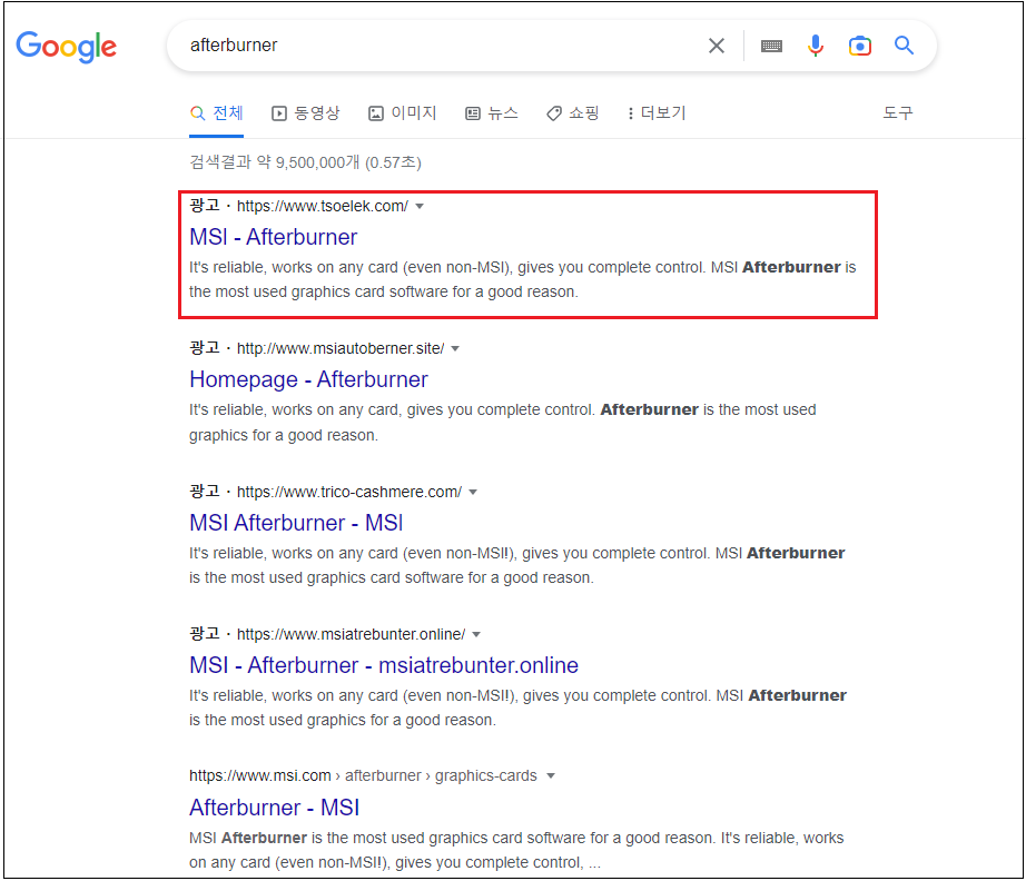 구글 검색엔진에서 'Afterburner'를 검색하면 공식 홈페이지 보다 광고 페이지가 더 상단에 뜨는데, 검색결과 앞에 광고라고 표시되어 있긴 하지만 검은색 텍스트로 표기되어 있어 주의깊게 보지 않으면 쉽게 인지하기 어렵습니다.