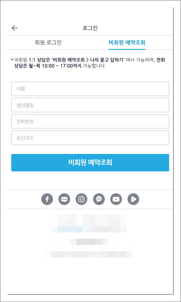 실제 앱과 다르게 별도의 회원가입은 진행되지 않으며 로그인 기능 또한, 작동하지 않습니다. 다만 비회원 예약조회는 가능합니다.