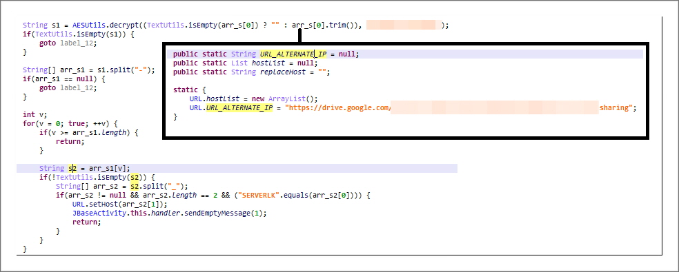 그에 대한 방법으로 구글 드라이브를 활용하고 있으며 특정 파일명을 가져와 AES 방식으로 복호화하여 새로운 서버의 아이피로 활용합니다.