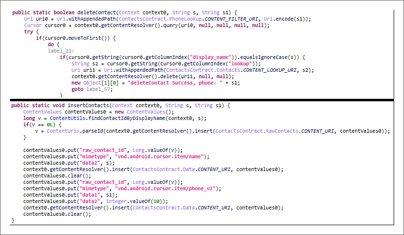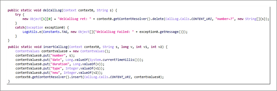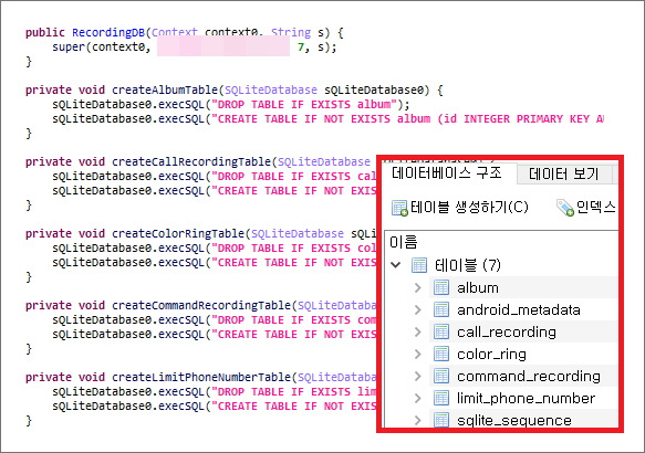 추가로 설치한 악성 앱은 다양한 기능을 수행하면서, DB를 활용합니다. 통화 녹음이나 앨범을 탈취하고 강제로 전화를 걸거나 패스할 전화번호 등을 등록하여 제어하고 있습니다.
