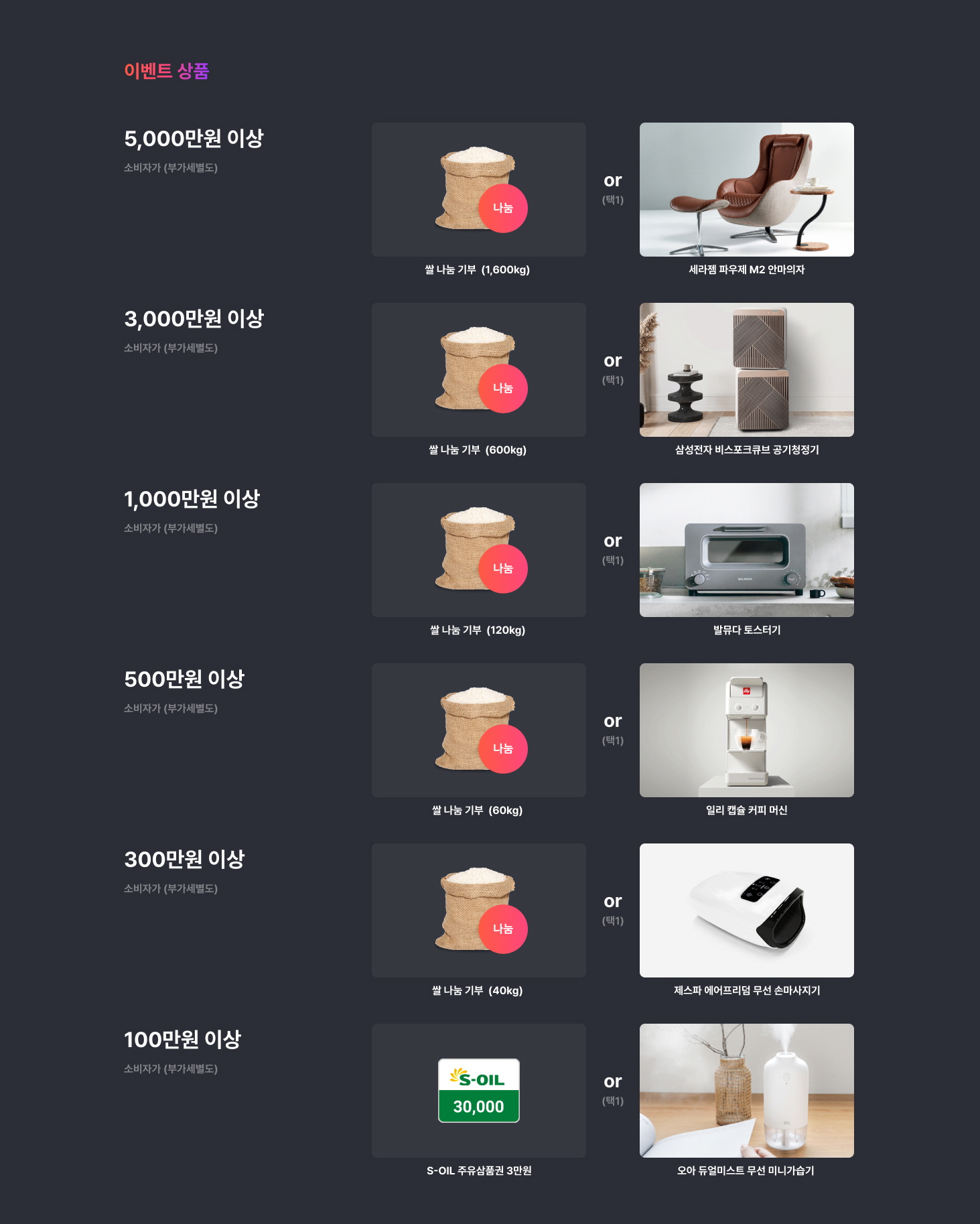 - 경품 1은 사랑의 나눔을 통해 신청 기관이 위치한 지역에서 생산된 쌀을 기부(기부증서 제공)