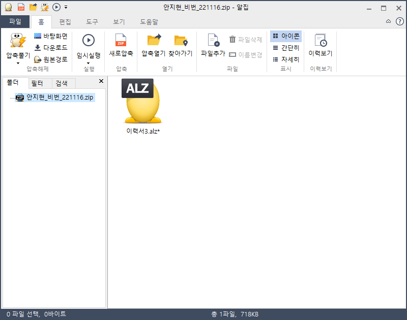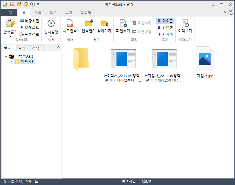 압축파일은 이중 압축이 되어있으며, 압축파일 내에는 '&이력서_221116(경력사항도 같이 기재하였습니다 잘 부탁드립니다)', '&지원서_221116(경력사항도 같이 기재하였습니다 잘 부탁드립니다)' 파일명을 가진 2개의 실행파일과 jpg 파일 1개가 포함되어 있습니다.