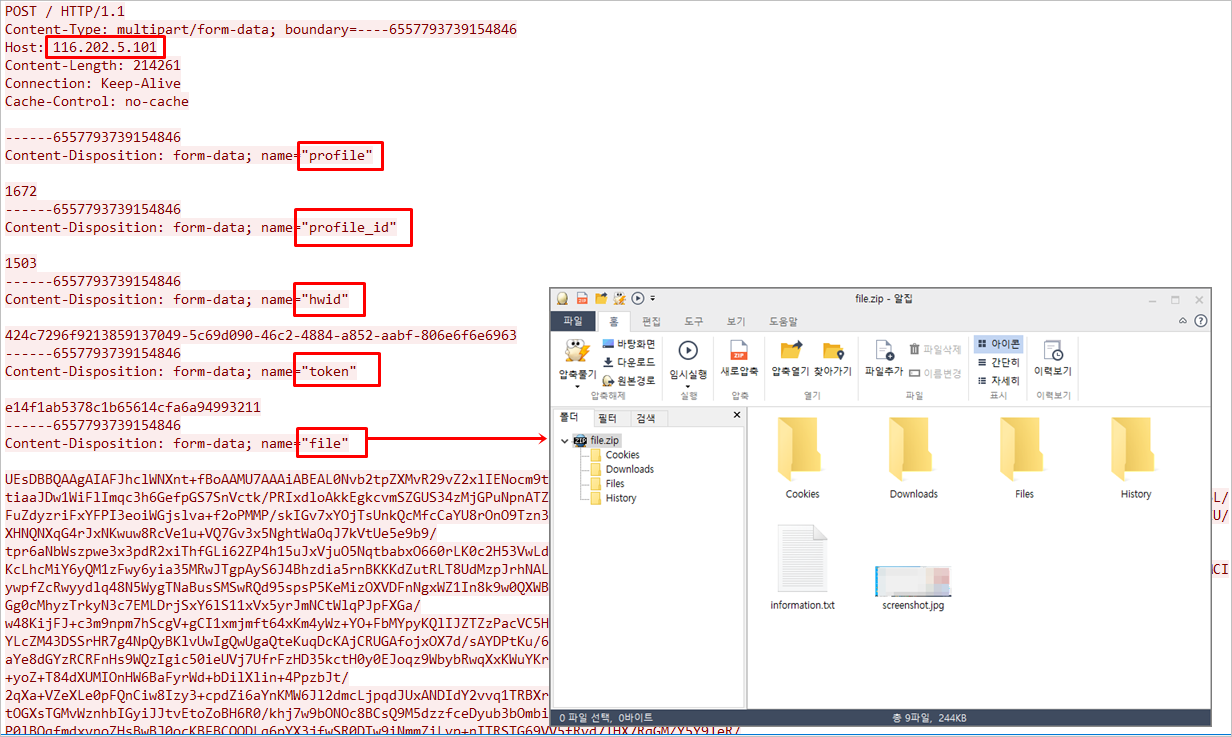 정보 수집이 완료되면 현재 동작중인 화면을 찍은 screenshot.jpg 파일과 함께 수집 정보와 시스템 정보를 취합한 파일들을 압축하여 C&C 서버로 전송합니다.