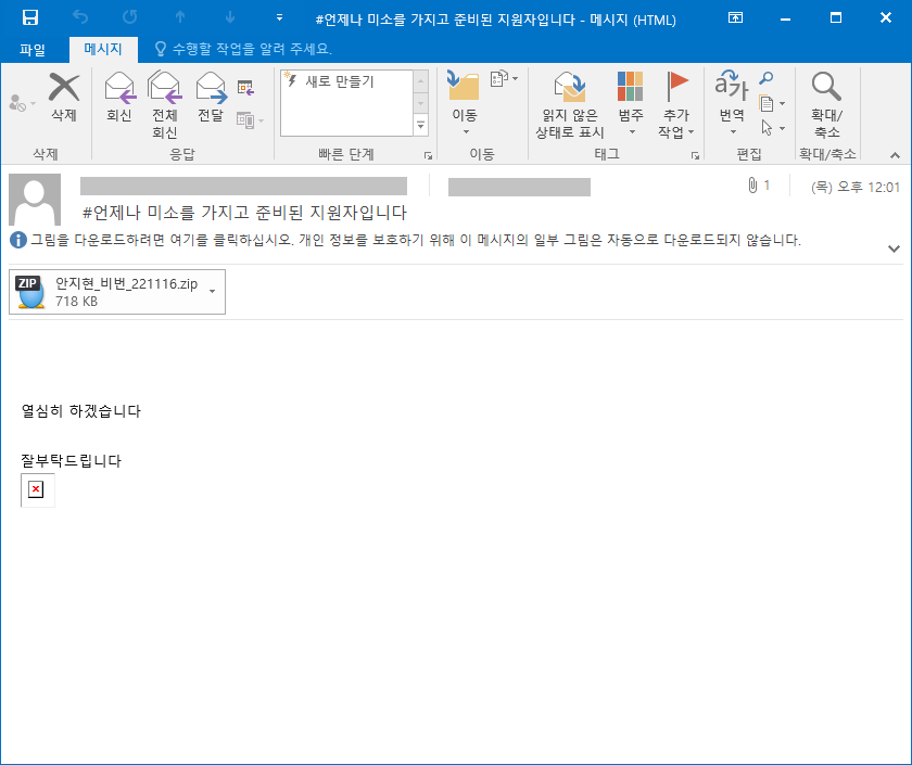 이번에 발견된 공격은 "#언제나 미소를 가지고 준비된 지원자입니다."라는 제목의 입사지원 메일로 위장하고 있으며