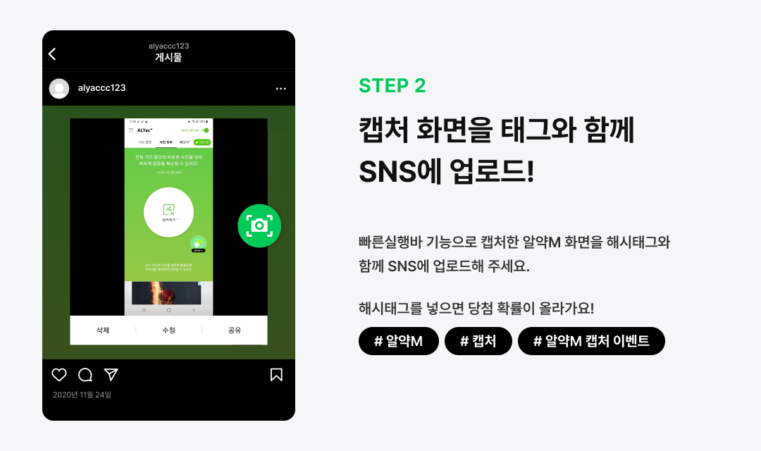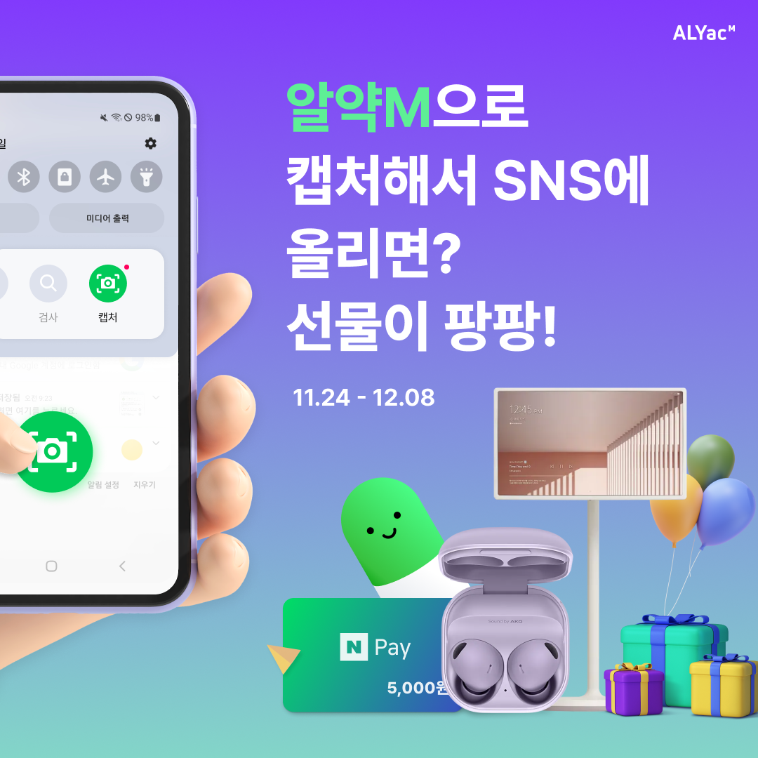 빠른 실행바로 손쉽게 실행할 수 있는 알약M 캡처 기능을 사용하고, SNS 인증까지 완료하여 푸짐한 이벤트 경품도 받아가시길 바랍니다.