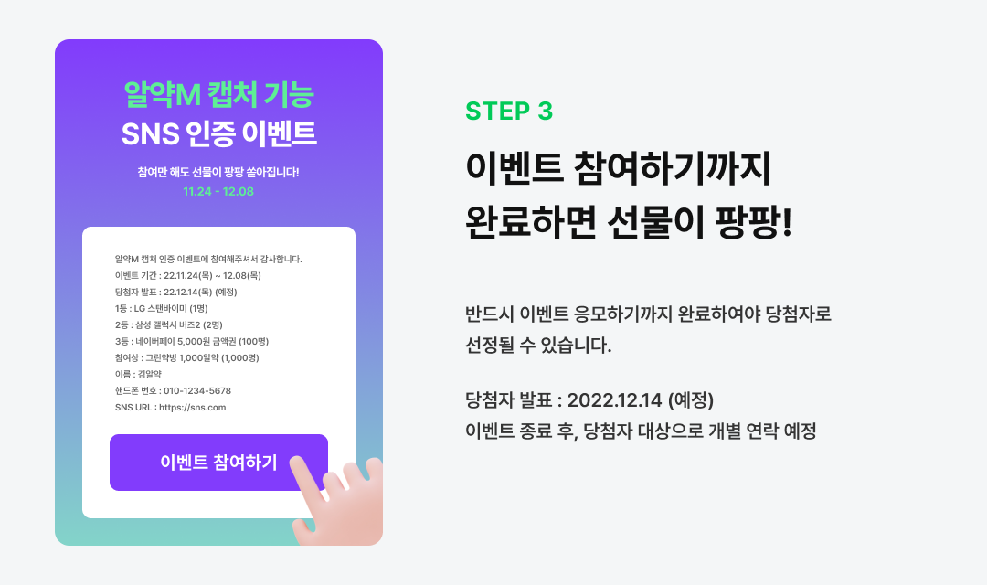 ※ 알약M 구버전을 사용하시는 경우 캡처 기능이 지원되지 않을 수 있습니다. 원활한 이벤트 참여를 위해 최신 버전으로 업데이트 해주세요.